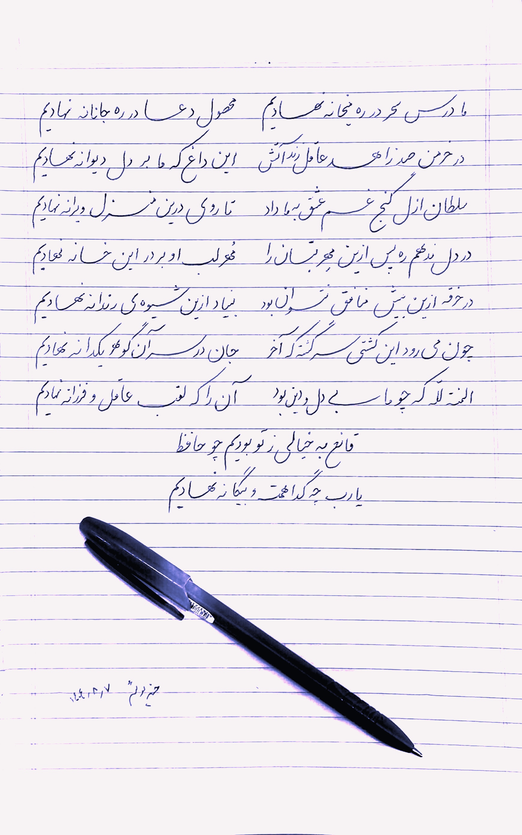 بگذریم؛ آن سوال این بود که سرنوشت ما از پیش نوشته شده یا قلم تقدیر به دست خود ماست و ما باید آن(زندگی) را نگارش کنیم؟ جواب مناسبی نیافتم نمیدانم، شاید تند میروم در جواب گرفتن پرسش هایی که شاید هیچ جوابی نداشته باشند...
